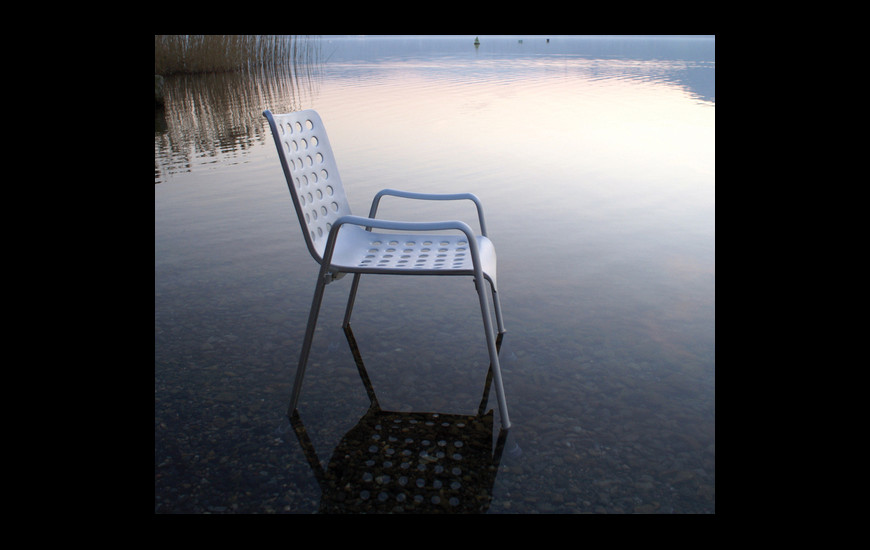 Las perforaciones le dan a la silla un aire fresco y liviano. Tiene un brillo metálico logrado con tratamiento químico, de fácil mantenimiento.